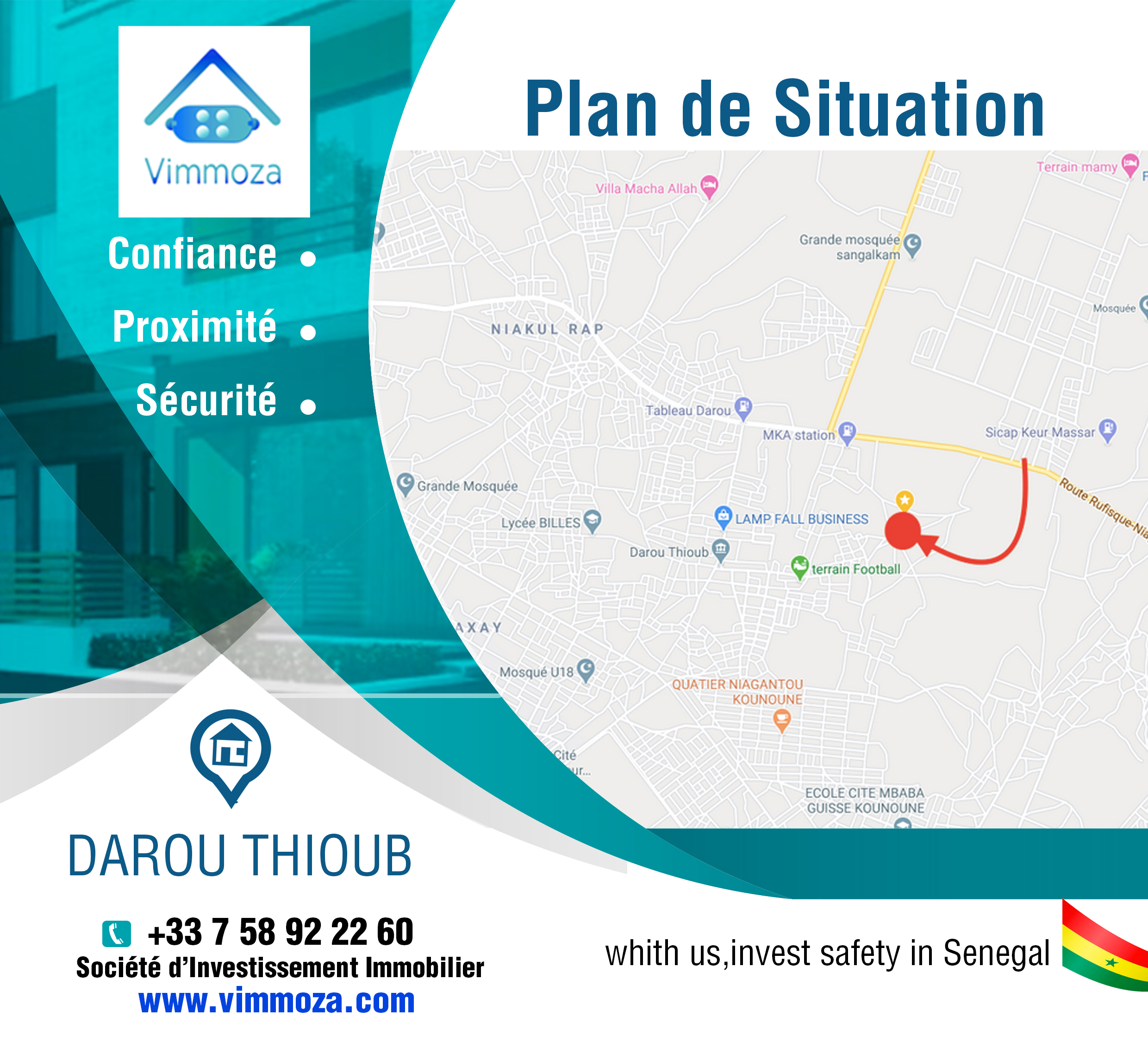 En voiture : à 1 minutes de Niagues et de Sangalkam, à 2 minutes de Keur Ndiaye Lô, à 3 minutes de l’autoroute à péage, à 5 minutes de Keur Massar, à 6 minutes du Lac Rose, à 8 minutes de la plage et à 15 minutes du Centre-Ville par autoroute.